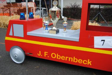 Der schwarze Bolide „Black Labels Baites“ der ausrichtenden Jugendfeuerwehr Obernbeck, hatte Probleme, der erfahrene Fahrer Vico Valentin (15 Jahre) entschied nach dem 3. Wertungslauf die Rennpappe in die Boxengasse zu lenken. Einzige Bemerkung des Rennfahrers „Die Kiste läuft nicht rund!“ Jugendwart Torsten Stürzebecher und Betreuerin Sarah Flemming modifizierten an der schwarzen Kiste, bis sie nach 10 Minuten wieder auf die Startrampe konnte. Sichtlich zufrieden fuhr dann Vico Valentin im nächsten Wertungslauf durchs Ziel.