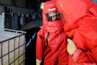 Aufgrund der unbekannten Flüssigkeit sicherte die Feuerwehr die Einsatzstelle weiträumig ab, Einsatzkräfte rüsteten sich mit schwerem Atemschutz in Chemikalienschutzanzügen (CSA) aus. Sofort untersuchte ein Trupp unter CSA den Kunststoffbehälter und stellte eine Leckage fest. Rund 75 Meter mussten die Einsatzkräfte in den bewegungseinschränkenden Anzügen zurücklegen, um geeignetes Werkzeug für die Schließung des Lecks zu holen.
