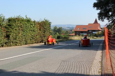 Mit zwei vorbereiteten Bahnen wurde der „Nordhang“ in Obernbeck zur Rennstrecke für 21 Teilnehmer mit Seifenkisten. Den ganzen Tag über schossen die selbstgebauten Fahrzeuge die 200-Meter-Strecke hinab.