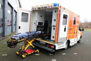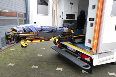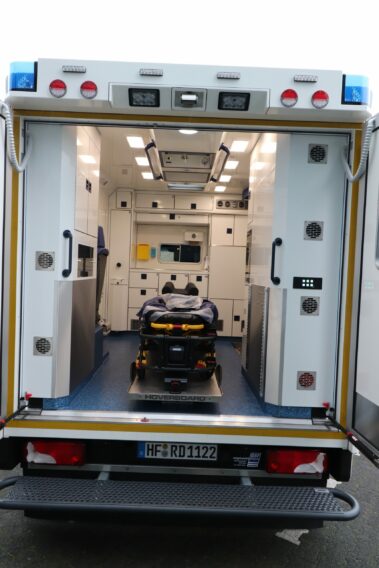 Der Rettungswagen besitzt eine rückenschonende Neuerung: an Bord befindet sich eine elektro-hydraulische Fahrtrage. Die neue Fahrtrage stellt eine erhebliche Erleichterung für die Kolleginnen und Kollegen im Rettungsdienst dar. Die Fahrtrage kann ebenfalls schwergewichtige Patienten mit einem maximalen Gewicht von 318 kg aufnehmen. Zusätzlich zur neuen Fahrttrage wird ein Tragstuhl mitgeführt, der mit einer Treppenraupe ausgestattet ist. Mit diesem Treppen-Tragestuhl können nicht gehfähige Patienten ohne große Kraftanstrengungen der RTW-Besatzung aus einem Obergeschoss über die Treppenstufen nach unten gleiten oder wenn das Gleiten nicht möglich ist, getragen werden.